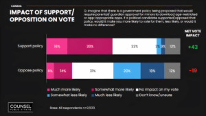 Few Canadians think technology companies are over-regulated, and in our research, voters rewarded politicians who backed stronger age-verification standards. The data show a +43 net vote impact for candidates who support these policies, and a penalty for those who oppose them.