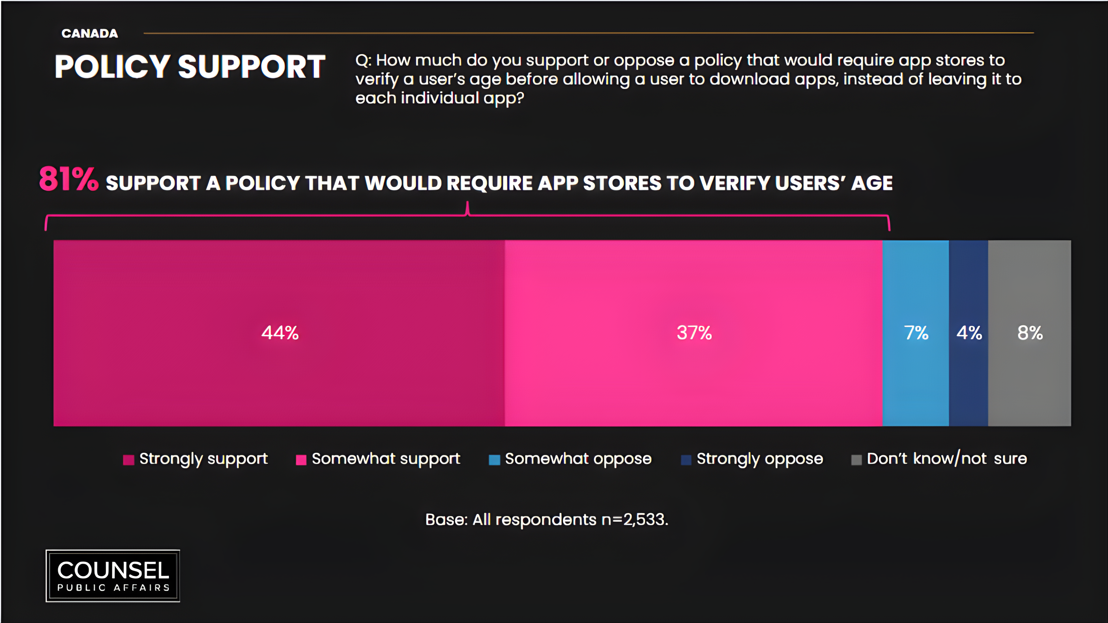 Few Canadians think technology companies are over-regulated, and in our research, voters rewarded politicians who backed stronger age-verification standards. The data show a +43 net vote impact for candidates who support these policies, and a penalty for those who oppose them.